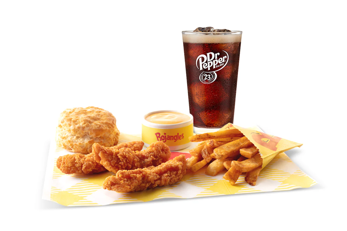 3 whole-breast hand-breaded chicken tenderloins made with bold flavor and served with a made-from-scratch biscuit, a fixin’, and a Dr Pepper.